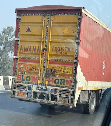 Being a driver in India is not like being a driver anywhere else. What could’ve been harrowing and stressful was neither in Mukesh’ car. He had snacks, drinks and pillows for me, and was excellent at inserting our vehicle into and out of the free-for-all riot that is traffic in India. Rickety buses crammed with bodies, hundreds of motorbikes, often with a guy driving, a sidesaddled sari’d woman on back and a kid or two in front, tuk tuks, and trucks painted in fading bright colors, festooned in garlands, glittery poms and tassles; cars and taxis, pedestrians, bicycles, cows, dogs. All of it is going somewhere, not in the same direction necessarily, and often without lanes, signs, signals, traffic cops, or any rules or laws that I could discern. Everything you’ve heard about the horns blaring is true. It’s not rudeness, it’s how to let someone know you’re there and you’re coming. Lots of trucks instruct approaching drivers to “blow horn.”